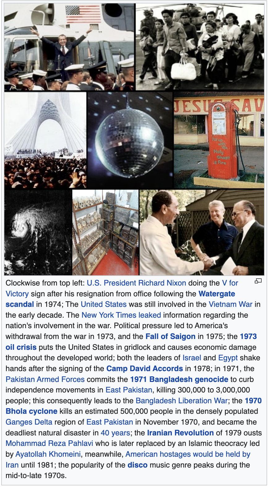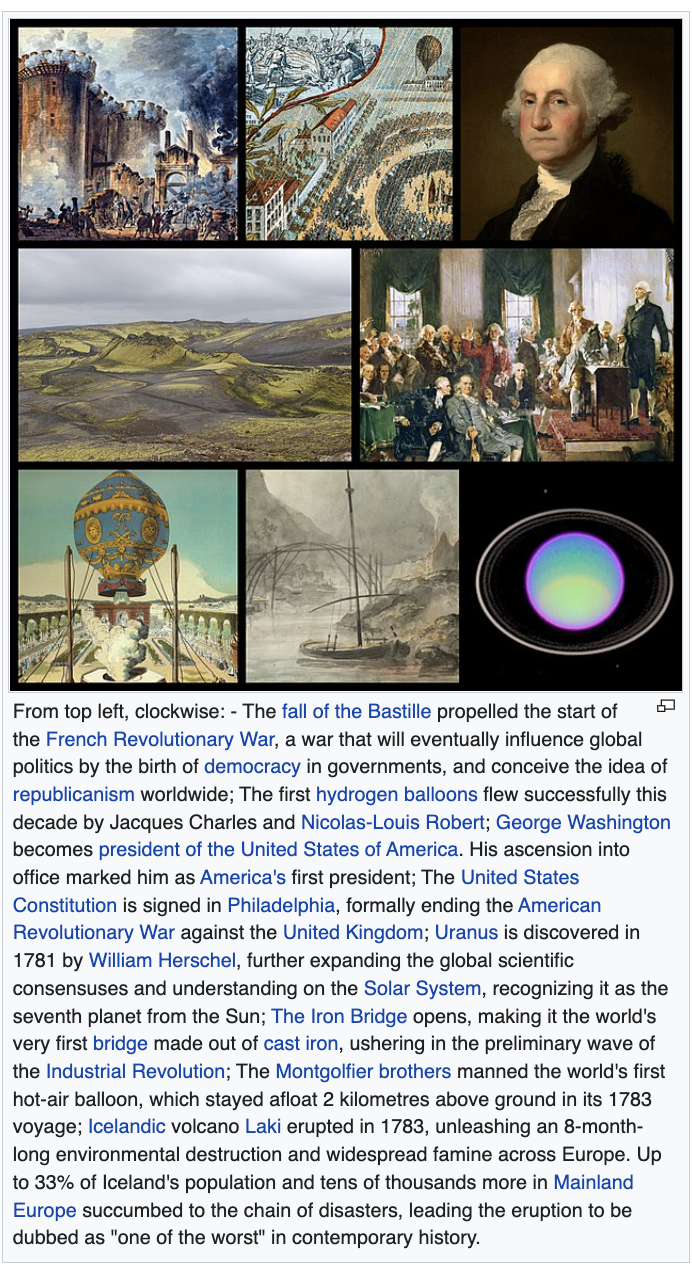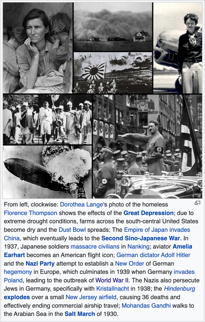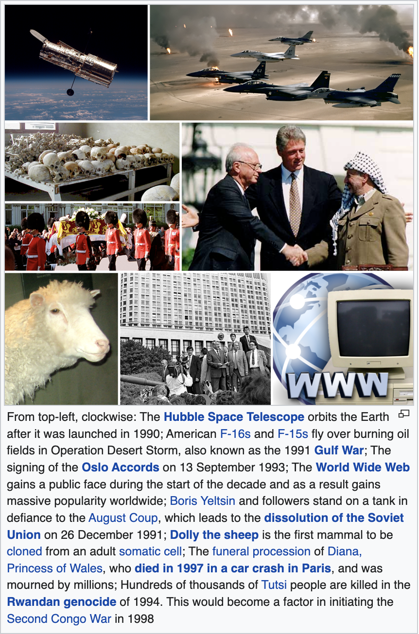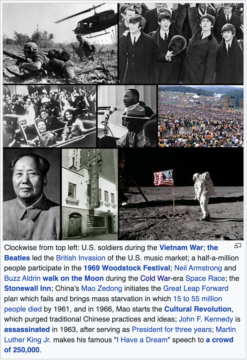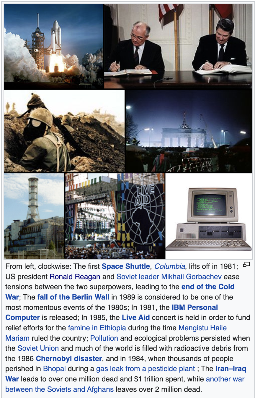 Wikipedia has a cool feature where they summarize various decades in pictures. These are really fun to see, to get a sense of history - especially a sense of what events were happening at the same time.