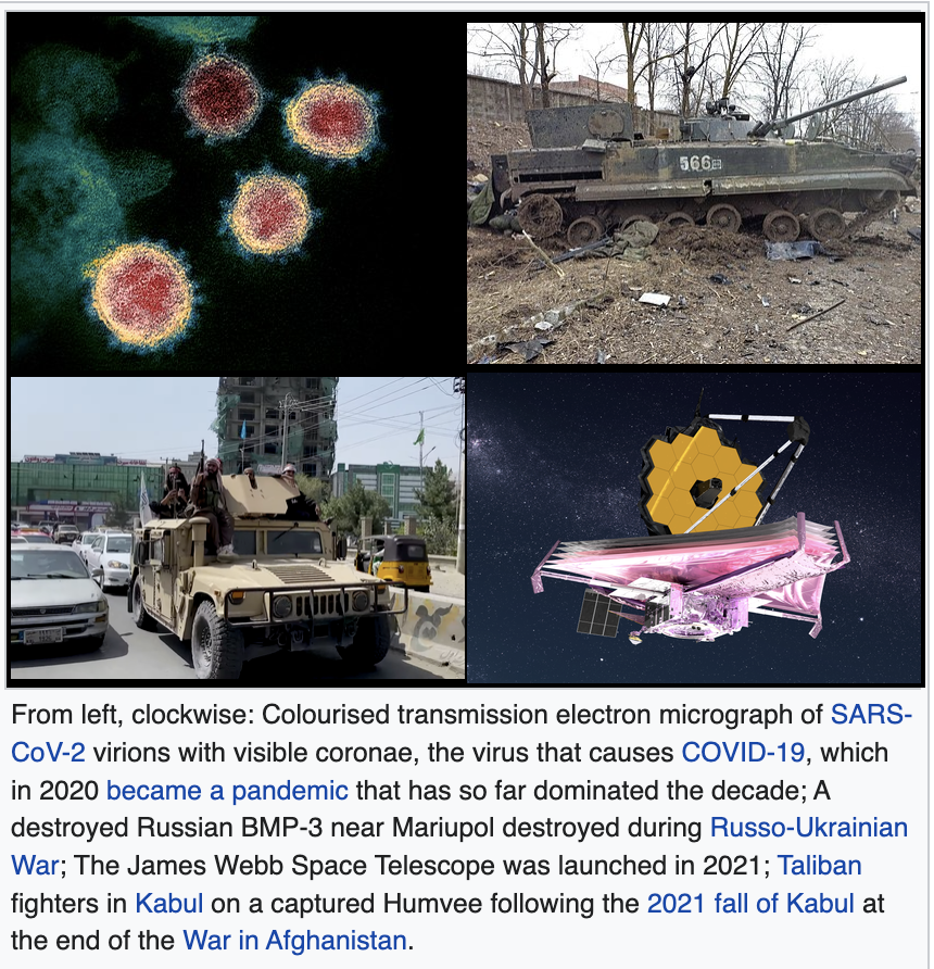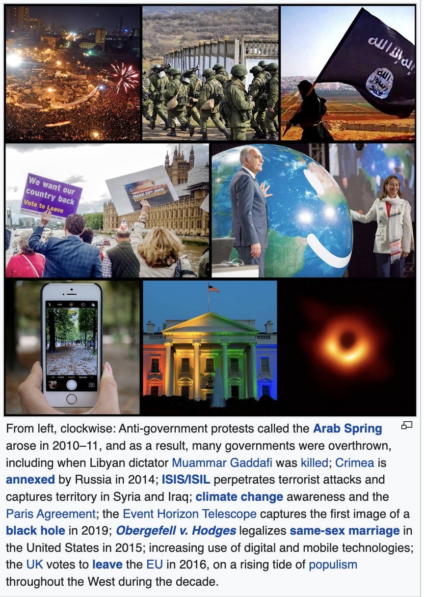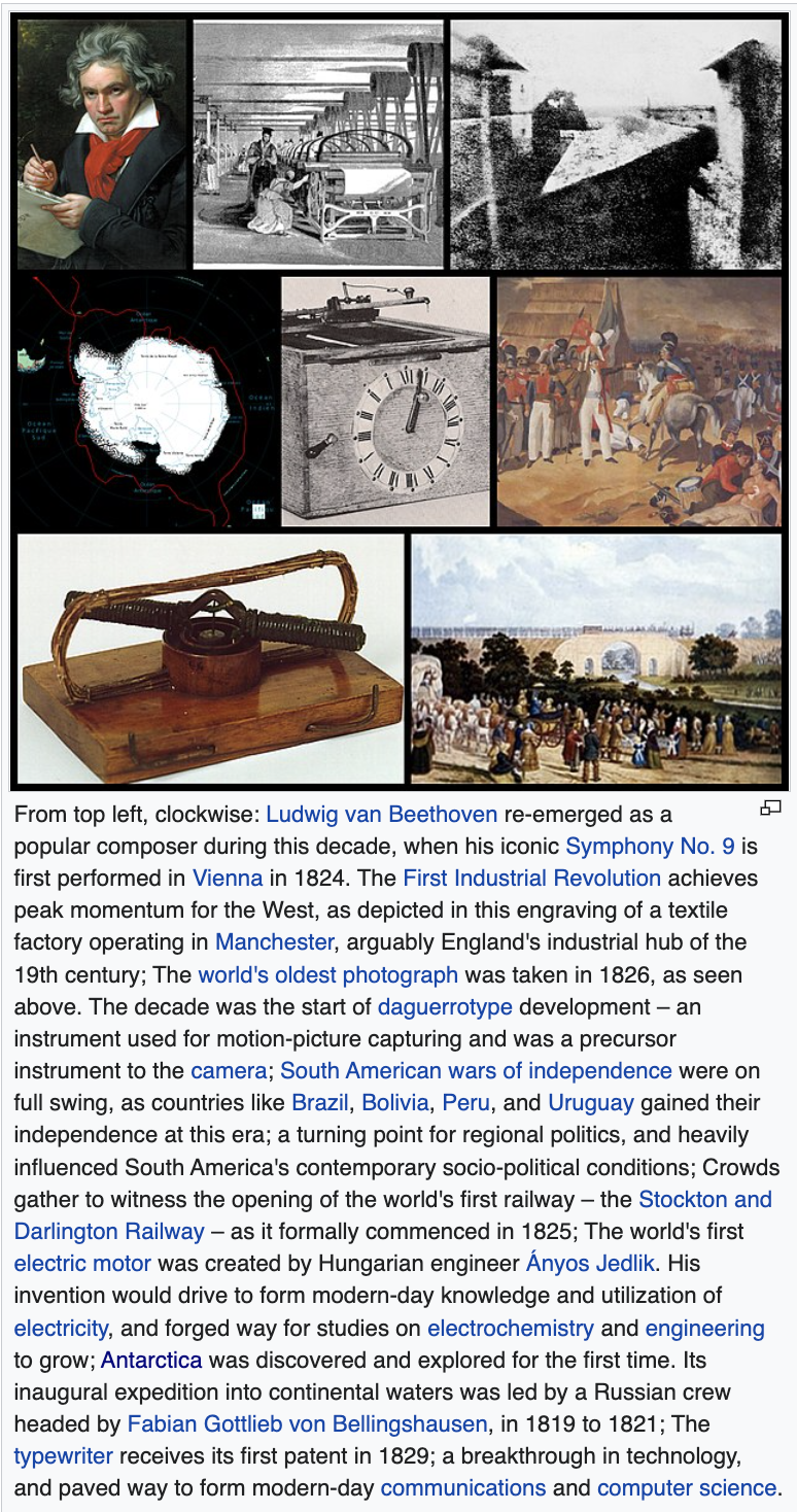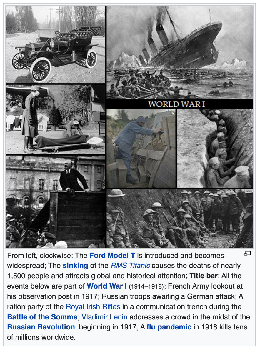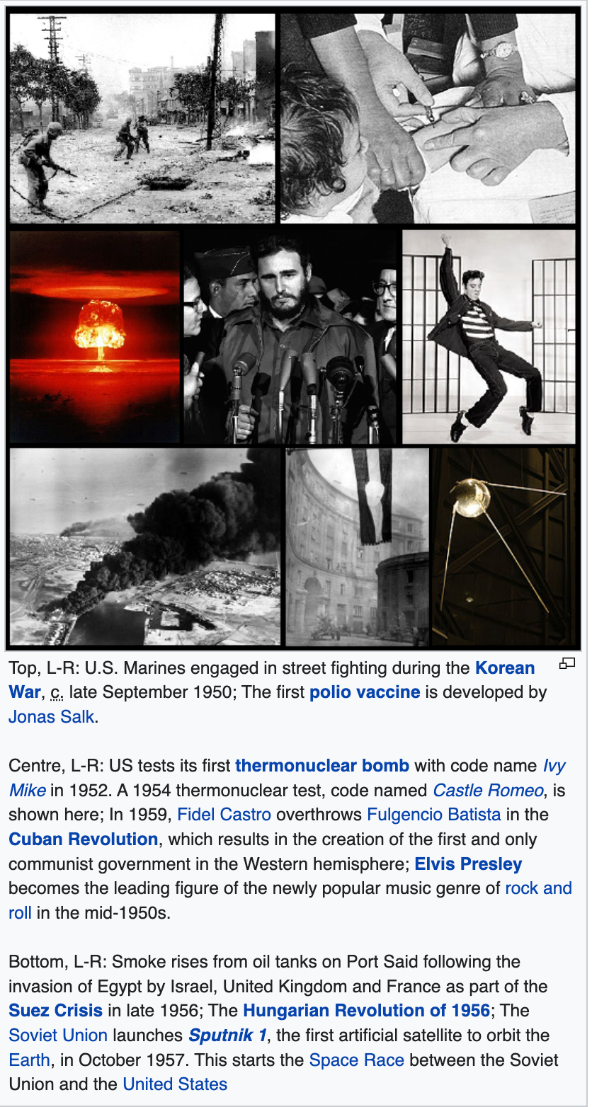 Wikipedia has a cool feature where they summarize various decades in pictures. These are really fun to see, to get a sense of history - especially a sense of what events were happening at the same time.